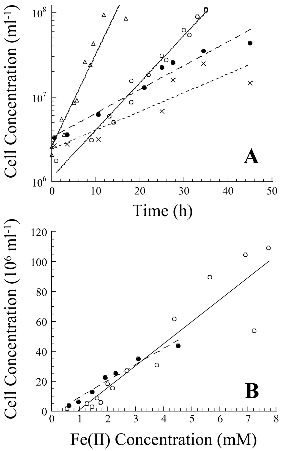 HÌNH 2. (A) Sự phát triển của P. aerophilum trong bình lên men 20 lít trên dung dịch 10 mM KNO3 (▵, đường liền nét) hoặc 20 mM Fe(III) citrate (○, đường liền nét) và trong ống Balch 25 ml trên dung dịch 100 mM Fe(III) oxit không tan mà không có (•, - - -) và có (×, - - - - -) chứa trong ống thẩm tách. (B) Hiệu suất tăng trưởng của các nuôi cấy được thực hiện trong bình lên men 20 lít trên dung dịch 20 mM Fe(III) citrate (○, đường liền nét) hoặc trong ống Balch 25 ml trên dung dịch 100 mM Fe(III) oxit không tan (•, - - -).