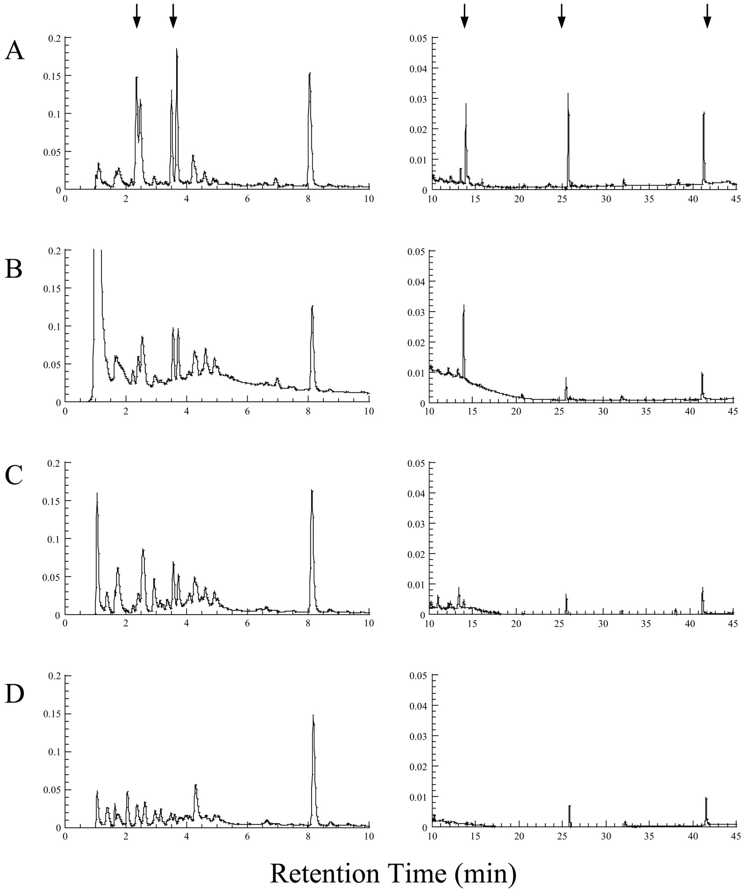HÌNH 1. Độ hấp thụ ở bước sóng 280 nm sau khi tách bằng sắc ký lỏng các hợp chất hòa tan trong dịch nổi đã sử dụng từ các môi trường nuôi cấy ở 100 mM Fe(III) oxit (A), 20 mM Fe(III) citrat (B) hoặc 10 mM KNO3 (C) và dịch nổi từ môi trường không cấy vi sinh (D). Các mũi tên chỉ ra các đỉnh cần quan tâm.