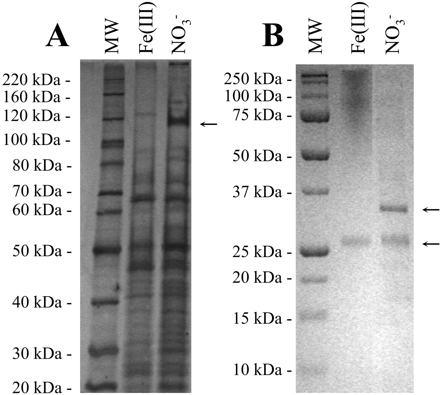 HÌNH 3. Điện di gel và nhuộm bạc (A) hoặc nhuộm heme (B) của các phân đoạn màng được chuẩn bị từ các nuôi cấy được nuôi cấy trong môi trường sắt và nitrat. (A) Vạch protein được sử dụng để xác định khối lượng peptide được chỉ ra bằng mũi tên, và khối lượng phân tử của các protein chuẩn theo kích thước phân tử (làn MW) được hiển thị ở bên trái. Gel chứa 8% polyacrylamide. (B) Hai vạch protein được nhuộm heme được xác định bằng mũi tên, và khối lượng phân tử của các protein chuẩn được nhuộm trước (làn MW) được hiển thị ở bên trái.